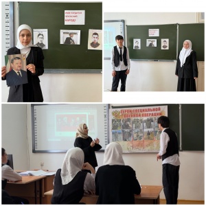 Заместитель директора по ВР, Ибрагимова Р.М., провела урок мужества по теме "Герои Родного края". На занятии ребята поговорили о земляках, чьи имена золотыми буквами вписаны в историю. Разговор шел не только о героях ВОВ, но и о наших ...