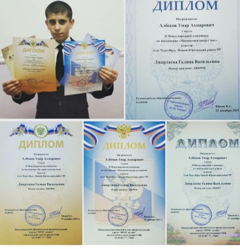 23.12.2019Обучающийся 9 класса МБОУ «СОШ с.Чурч-Ирзу» Албеков Умар принял участие в Международных олимпиадах по математике «Великие математики», «Математика вокруг нас» и «Математическая вселенная», проводимых Международным образовательно-просветительским порталом «ФГОС онлайн».Во всех этих олимпиадах Умар занял 1 места и награждён дипломами.Также Умар награждён дипломом за 1 место в Международной олимпиаде по математике для 9 класса.МОЛОДЕЦ! ГОРДИМСЯ ТОБОЙ!ПОЗДРАВЛЯЕМ Умара и его наставника, учителя математики высшей квалификационной категории Джарлаеву Галину Васильевну с этими ДОСТИЖЕНИЯМИ и ЖЕЛАЕМ им дальнейших УСПЕХОВ!ДАЛА Т1АЬХЬЕ БЕРКАТЕ ЙОЙЛА, КХИАМАШ А ХУЬЛДА!