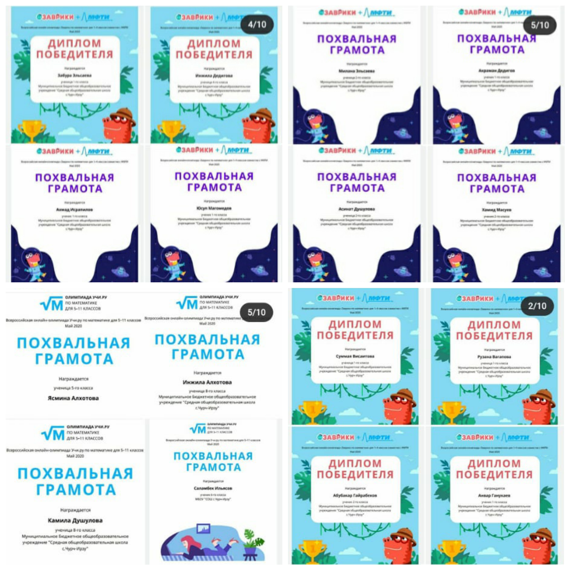 27.05.2020НАШИ ДОСТИЖЕНИЯ Обучающиеся МБОУ «СОШ с.Чурч-Ирзу» принимают активное участие во Всероссийских онлайн-олимпиадах, проводимых интерактивной образовательной платформой «Учи.ру» @uchi_ruВ период с 28 апреля по 25 мая 2020 года в олимпиаде «Заврики» по математике + знакомство с физикой от МФТИ для 1-4 классов, проведенной интерактивной образовательной платформой «Учи.ру» совместно с Московским физико-техническим институтом - ведущим российским ВУЗом по подготовке специалистов в области физики, математики, информатики, приняли участие 40 обучающихся начальных классов школы:✅ дипломами победителя награждены 14 человек (при этом 13 обучающихся показали 💯%-ный результат - 90 баллов из 90 возможных);✅ похвальными грамотами за высокие результаты - 14 человек;✅ 12 человек получили сертификаты от организаторов.МОЛОДЦЫ!ПОЗДРАВЛЯЕМ!