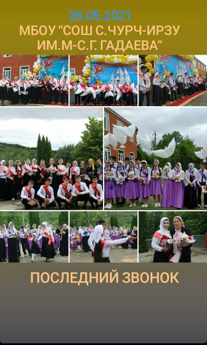 26.05.2021Сегодня, 26 мая 2021 года, для 6 юношей и 8 девушек 11 класса МБОУ «СОШ с.Чурч-Ирзу им.М-С.Г. Гадаева» прозвенел последний школьный звонок.Мы ПОЗДРАВЛЯЕМ их с окончанием школы и смело можем заявить, что они – хорошие ребята, достойные успеха.ЖЕЛАЕМ вам большой удачи в дальнейшем, высоких целей и непременных побед.Не забывайте школу, любимых учителей и своих товарищей, оставайтесь верны своему сердцу и живите по принципам счастья.Вам предстоит сделать важный шаг, чтобы определиться с направлением жизненного пути.Пусть у вас, красивых, сильных, здоровых и перспективных молодых людей, воплотятся в жизнь самые смелые мечты и планы, пусть будущее радует вас новыми идеями, замыслами и достижениями.В добрый путь, дорогие выпускники!Пусть знания, с любовью привитые вам педагогами, станут прочной основой для дальнейшего образования, а навыки, освоенные в стенах школы, помогут безболезненно адаптироваться к взрослой самостоятельной жизни...