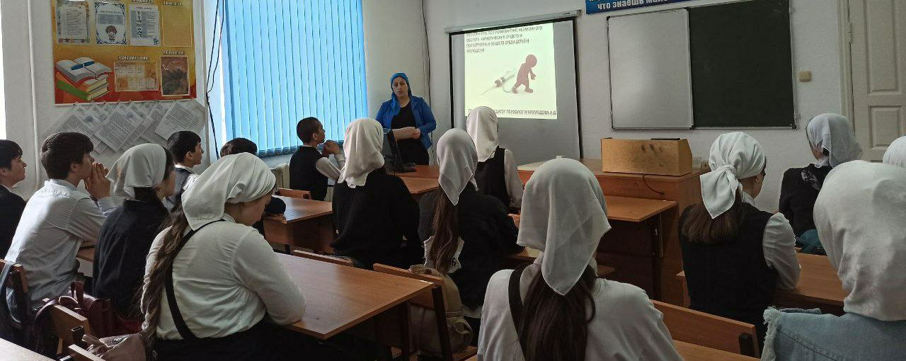 13.04.2022Во исполнение межведомственного плана мероприятий по профилактике употребления наркотических средств и психоактивных веществ среди несовершеннолетних на 2021-2023 годы, п.8 Плана-графика проведения профилактических мероприятий по результатам социально-психологического тестирования (СПТ) в ОО Ножай-Юртовского района, педагог-психолог Магомедова А.Д. провела беседу с обучающимися 8 класса.