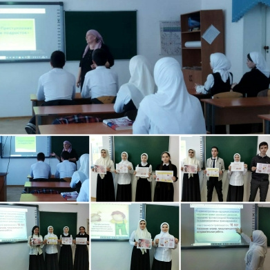 14.04.2022Во исполнение межведомственного плана мероприятий по профилактике употребления наркотических средств и психоактивных веществ среди несовершеннолетних на 2021-2023 годы, п.6 Плана-графика проведения профилактических мероприятий по результатам социально-психологического тестирования (СПТ) в ОО Ножай-Юртовского района, социальный педагог Исаева Х.В. провела классный час «Правонарушение среди подростков" в 11 классе.