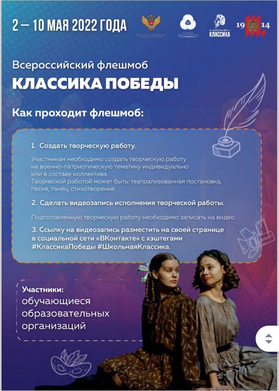 06.05.2022Со 2 по 10 мая 2022 г. проводится Всероссийский онлайн-флешмоб «Классика Победы», который реализуется в рамках Всероссийского проекта «Школьная классика». Организаторами онлайн-флешмоба являются Общероссийская общественно-государственная детско-юношеская организация «Российское движение школьников» и ФГБОУ ВО «Театральный институт имени Бориса Щукина при Государственном академическом театре имени Евгения Вахтангова» при содействии Минпросвещения России. Мероприятие направлено на воспитание чувства патриотизма у подрастающего поколения, укрепление преемственности поколений и воспитание гражданской ответственности и любви к Родине. К участию в мероприятии приглашаются обучающиеся образовательных организаций в возрасте от 8 до 17 лет (включительно).