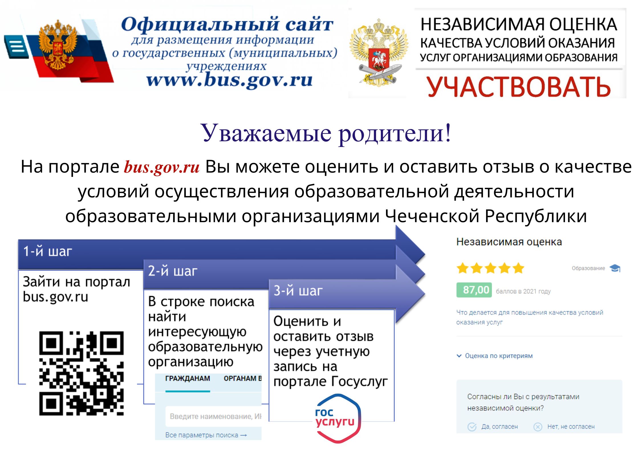 Уважаемые Родители! Вы можете оценить и оставить отзыв о качестве условий осуществления образовательной деятельности.