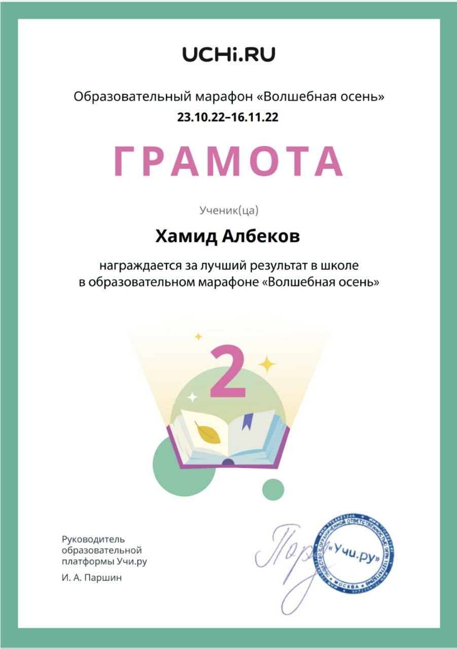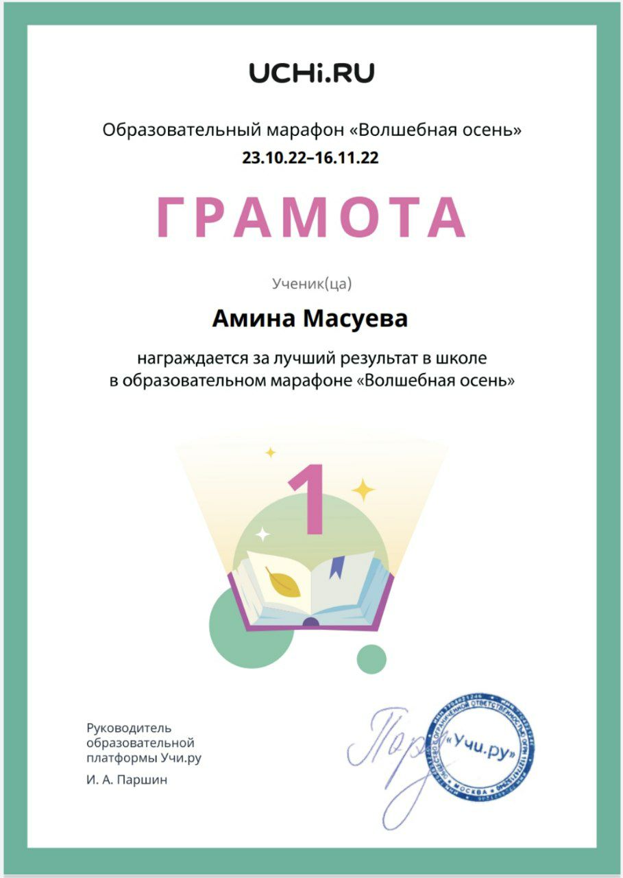 17.11.2022Обучающиеся МБОУ "СОШ с.Чурч-Ирзу им. М-С.Г. Гадаева" продолжают активно работать на образовательной платформе Учи.ру: решают карточки с заданиями по предметам и участвуют в образовательных марафонах. По итогам марафона «Волшебная осень», проведенного интерактивной образовательной платформой «Учи.ру» в период с 23 октября по 16 ноября 2022 года, 1 место по школе с результатом 200 баллов заняла Масуева Амина из 2 класса, 2 место с результатом 172 балла занял Албеков Хамид из 3 «А» класса, 3 место с результатом 111 баллов занял Магамедов Рамадан из 2 класса. МОЛОДЦЫ! ПОЗДРАВЛЯЕМ! Участие в образовательных марафонах и решение карточек с заданиями способствует повторению и закреплению пройденных тем по основным предметам, расширению кругозора обучающихся.