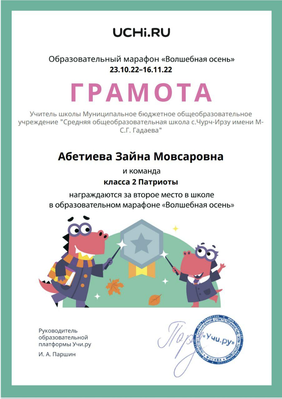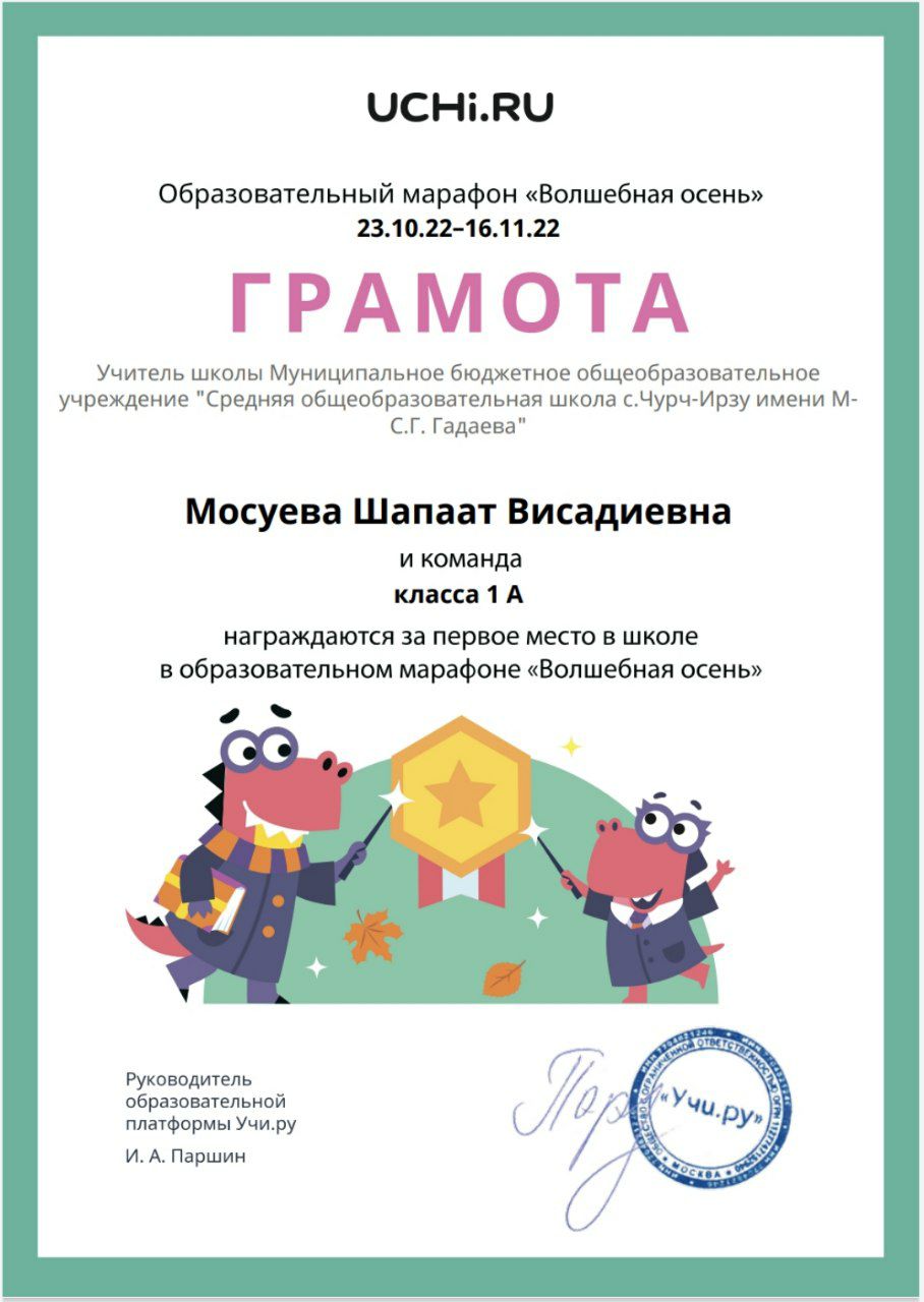 16.11.2022Обучающиеся МБОУ "СОШ с.Чурч-Ирзу им. М-С.Г. Гадаева" приняли участие в образовательном марафоне «Волшебная осень», проведенном интерактивной образовательной платформой Учи.ру в период с 23 октября по 16 ноября 2022 года. Марафон «Волшебная осень» — это соревнование по количеству решенных карточек на Учи.ру между учениками одновременно внутри одного класса и среди всей школы. По итогам марафона 1 место по школе с результатом 496 баллов занял 1 класс, 2 место с результатом 385 баллов у обучающихся 2 класса, 3 место с результатом 283 баллов у 4 класса. МОЛОДЦЫ!
