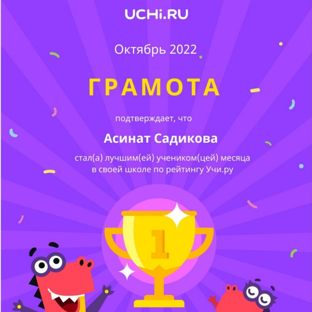 14.11.2022Подведены итоги работы обучающихся МБОУ "СОШ с.Чурч-Ирзу им. М-С.Г. Гадаева" на интерактивной образовательной онлайн-платформе «Учи.ру» за октябрь месяц 2022 года. Лучшей в рейтинге Учи.ру по итогам октября стала Садикова Асинат из 1 класса. МОЛОДЕЦ, Асинат! ПОЗДРАВЛЯЕМ!