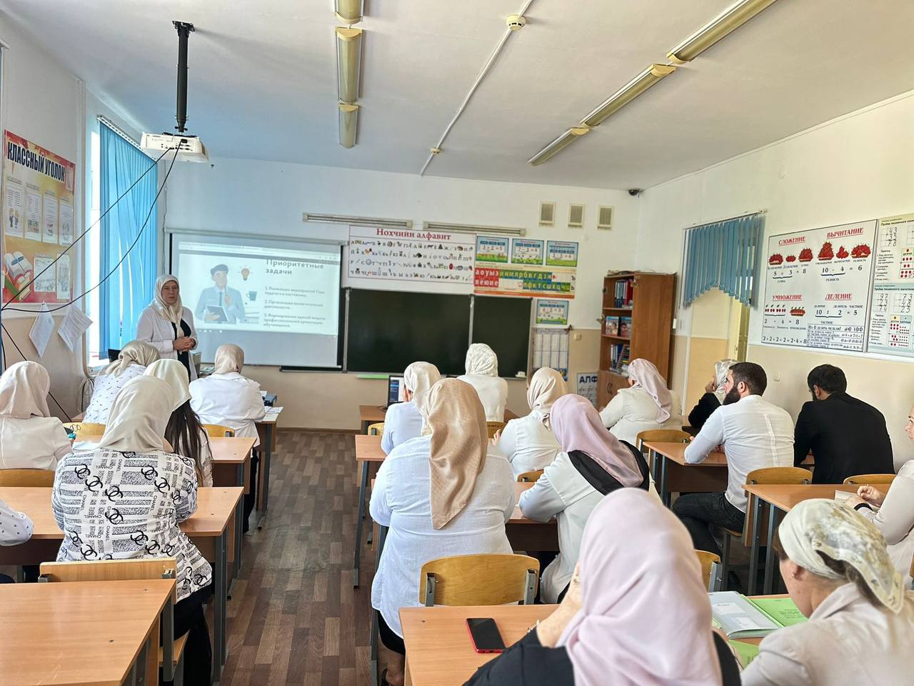 25.08.202325.08.2023г. в МБОУ «СОШ с.Чурч-Ирзу им.М-С.Г.Гадаева» состоялся педагогический совет. А.Д.Магамедова поздравила педагогический коллектив с началом нового учебного года. В своем выступлении она рассказала о национальных целях и стратегических задачах в системе российского образования. На педсовете был заслушан анализ работы школы за 2022-2023 учебный год, план работы на 2023-2024 учебный год.