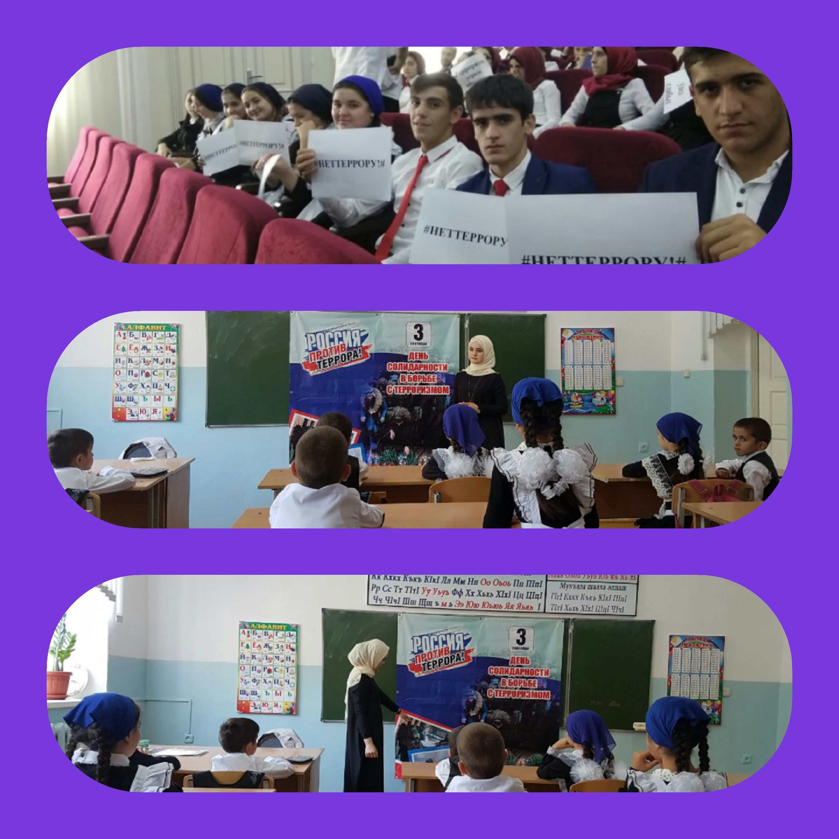 о проведенных мероприятиях, посвященных Дню солидарности в борьбе с терроризмом в МБОУ «СОШ с. Чурч-Ирзу» В России ежегодно 3 сентября отмечается особая дата-День солидарности в борьбе с терроризмом. В этот день россияне с горечью вспоминают жертв террористических актов, сотрудников правоохранительных органов, погибших при выполнении служебного долга. В этот день в школе проведены классные часы, беседы, приуроченные Дню солидарности в борьбе с терроризмом. Учащиеся 8,10 кл. приняли участие в районном мероприятии «Мы против террора» |